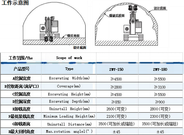 配备铣挖头后,可在硬度4F的煤巷或半煤巷掘进时工作,无需炮掘。本机带有快速连接器,岩 巷掘进时挖斗和铣挖头互换,爆破后用挖斗装渣,实现了一机两用;